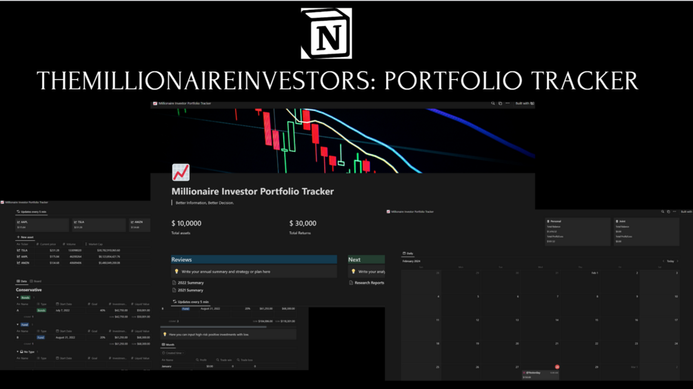 Transform your investment journey with Millionaire Tracker, our cutting-edge Notion template tailored for portfolio management. Streamline your financial strategies, track investments, and optimize your portfolio seamlessly. Harness the power of data-driven insights to propel your wealth accumulation and achieve financial freedom. Maximize your potential and elevate your path to millionaire status like never before.